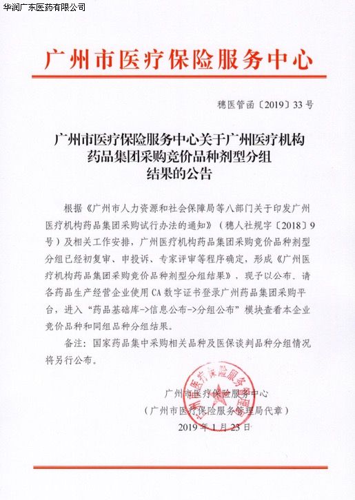 華潤(rùn)廣東醫(yī)藥有限公司關(guān)于廣州醫(yī)療機(jī)構(gòu)藥品集團(tuán)委托集中議價(jià)結(jié)果公布及合同簽訂的通知