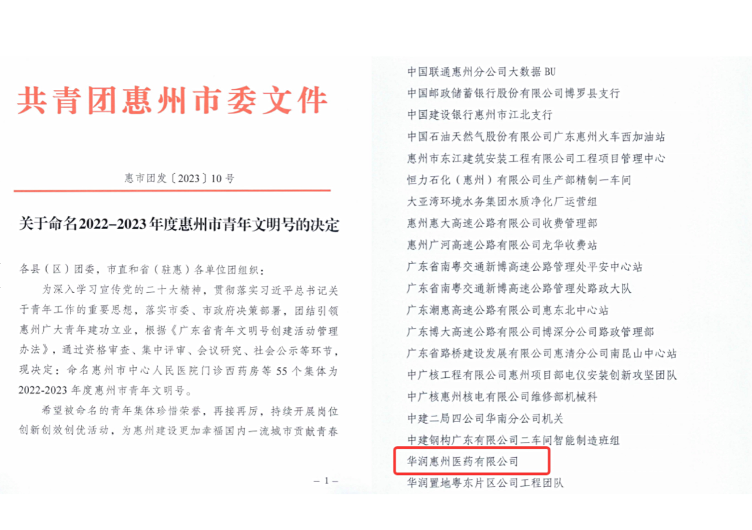 華潤惠州醫(yī)藥有限公司獲評惠州市2022-2023年度“青年文明號”稱號