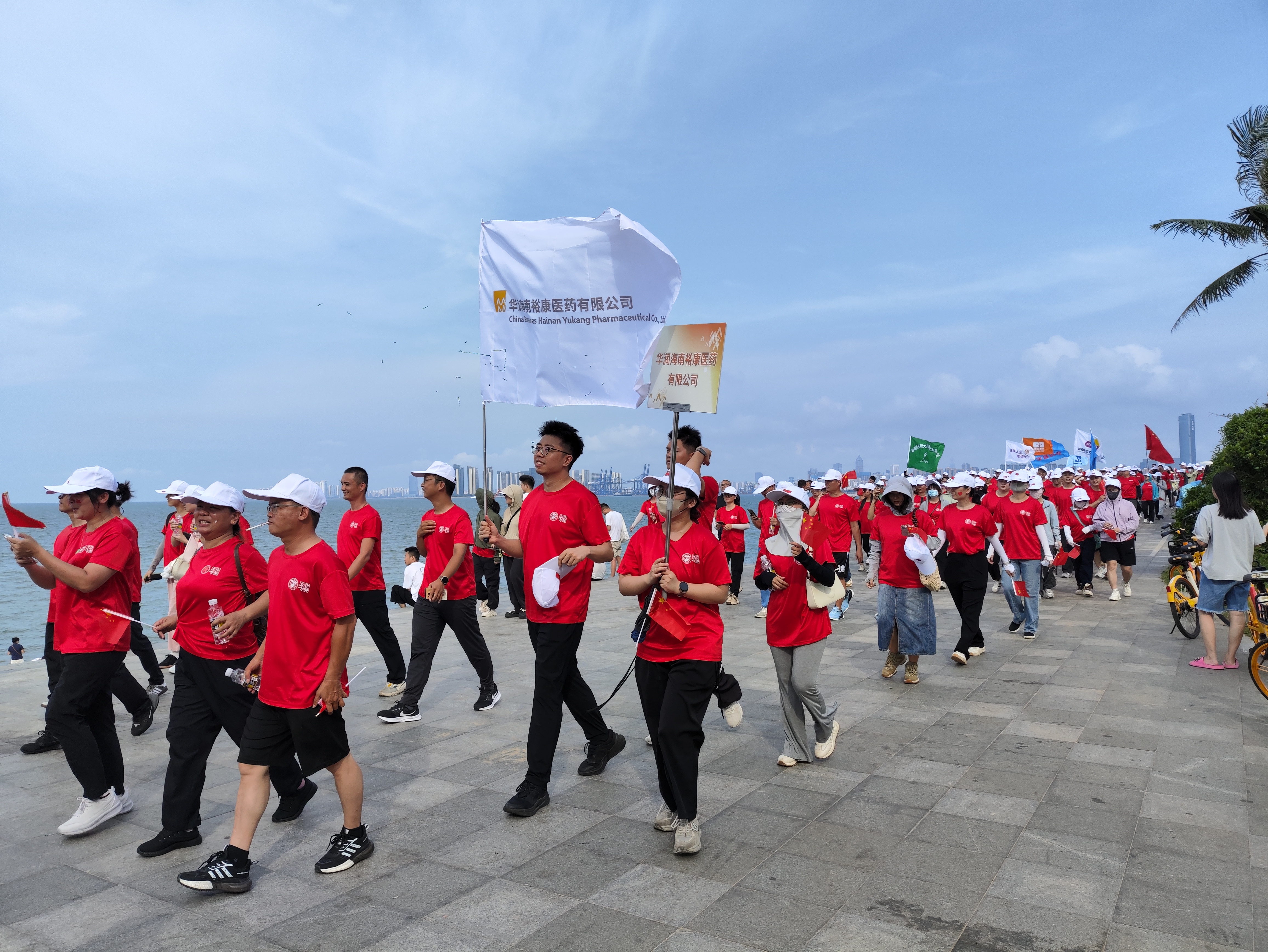 本次活動是海南省醫(yī)藥行業(yè)協(xié)會為慶祝中華人民共和國成立76周年、傳播“快樂工作,健康生活”理念、凝聚行業(yè)合力而舉辦?;顒拥攸c設在風景怡人的??谟^海臺,共40余家會員單位800余人參加,華潤海南??滇t(yī)藥作為副會長單位,組織近40名職工代表參加活動。“我們是——華潤海南??滇t(yī)藥;我們的方針是——質量第一,用戶至上;我們的使命是——潤澤健康,共創(chuàng)美好”。在熱身活動環(huán)節(jié),華潤海南??滇t(yī)藥的隊伍以洪亮的口號展示昂揚的士氣,在迎風招展的旗幟下,一聲高過一聲的“有華潤,多美好”震蕩在每個人耳畔。在協(xié)會會長劉文民熱情洋溢的開幕布致辭后,健步活動吹響了出發(fā)的號角,浩浩蕩蕩的徒步隊伍延伸在椰林沙灘上。華潤海南??滇t(yī)藥隊伍歷時一個小時完成了6公里的行程,無一人掉隊。