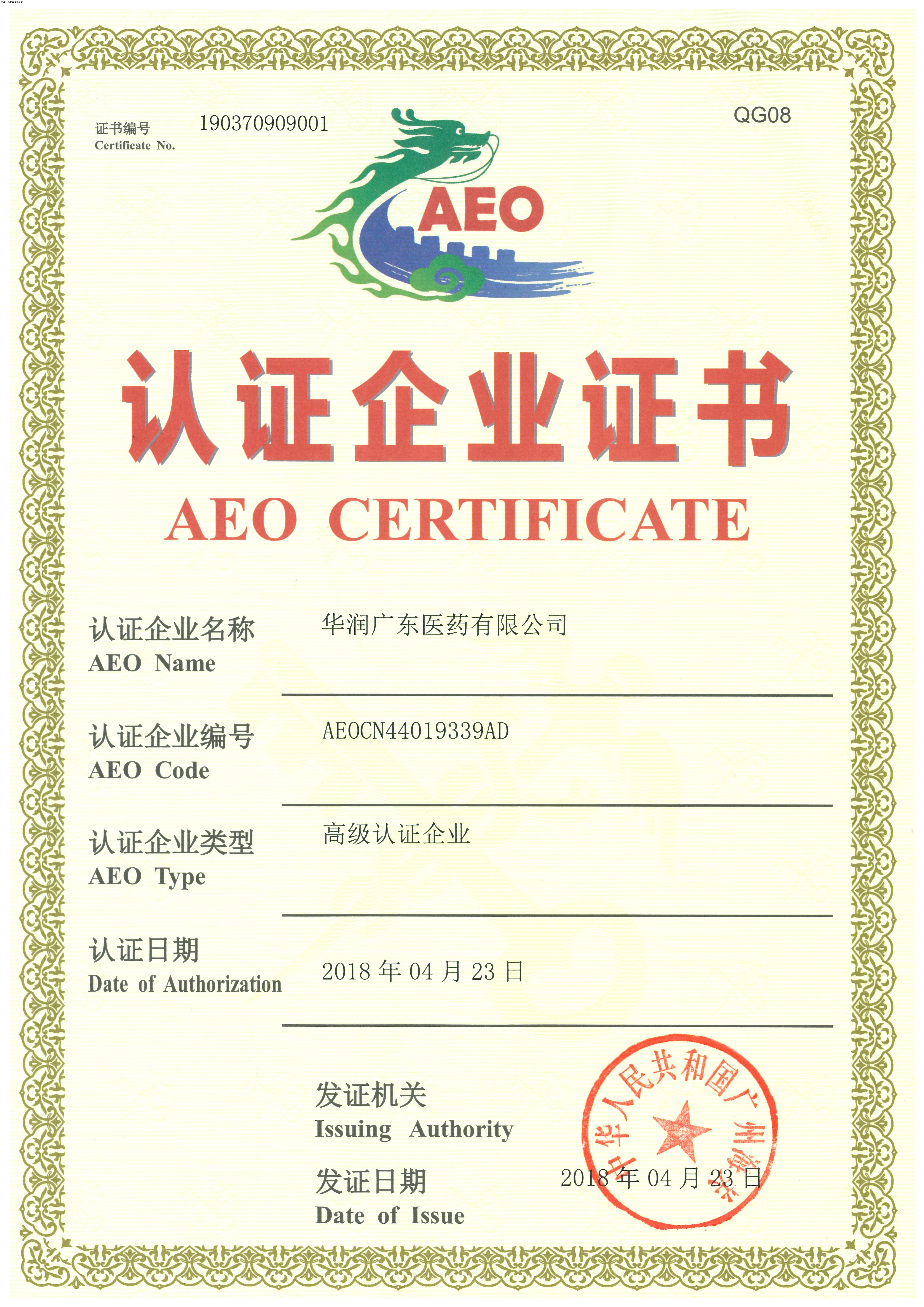 華潤廣東醫(yī)藥獲發(fā)海關(guān)AEO高級認(rèn)證企業(yè)證書