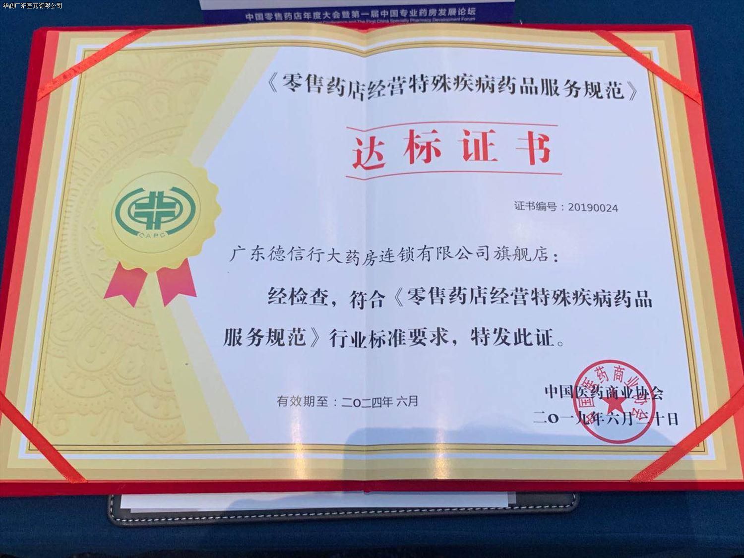 今年3月28日,廣東德信行大藥房旗艦店以391分高標(biāo)準(zhǔn)通過首批《零售藥店經(jīng)營特殊疾病藥品服務(wù)規(guī)范》達(dá)標(biāo)認(rèn)證(以下簡稱“特藥達(dá)標(biāo)認(rèn)證”)。達(dá)標(biāo)現(xiàn)場檢查指標(biāo)共計43項,包括人員培訓(xùn)、經(jīng)營服務(wù)環(huán)境、藥學(xué)服務(wù)、冷鏈管理等七大項31小項內(nèi)容,總分為 400 分,及格分?jǐn)?shù)為 340 分。