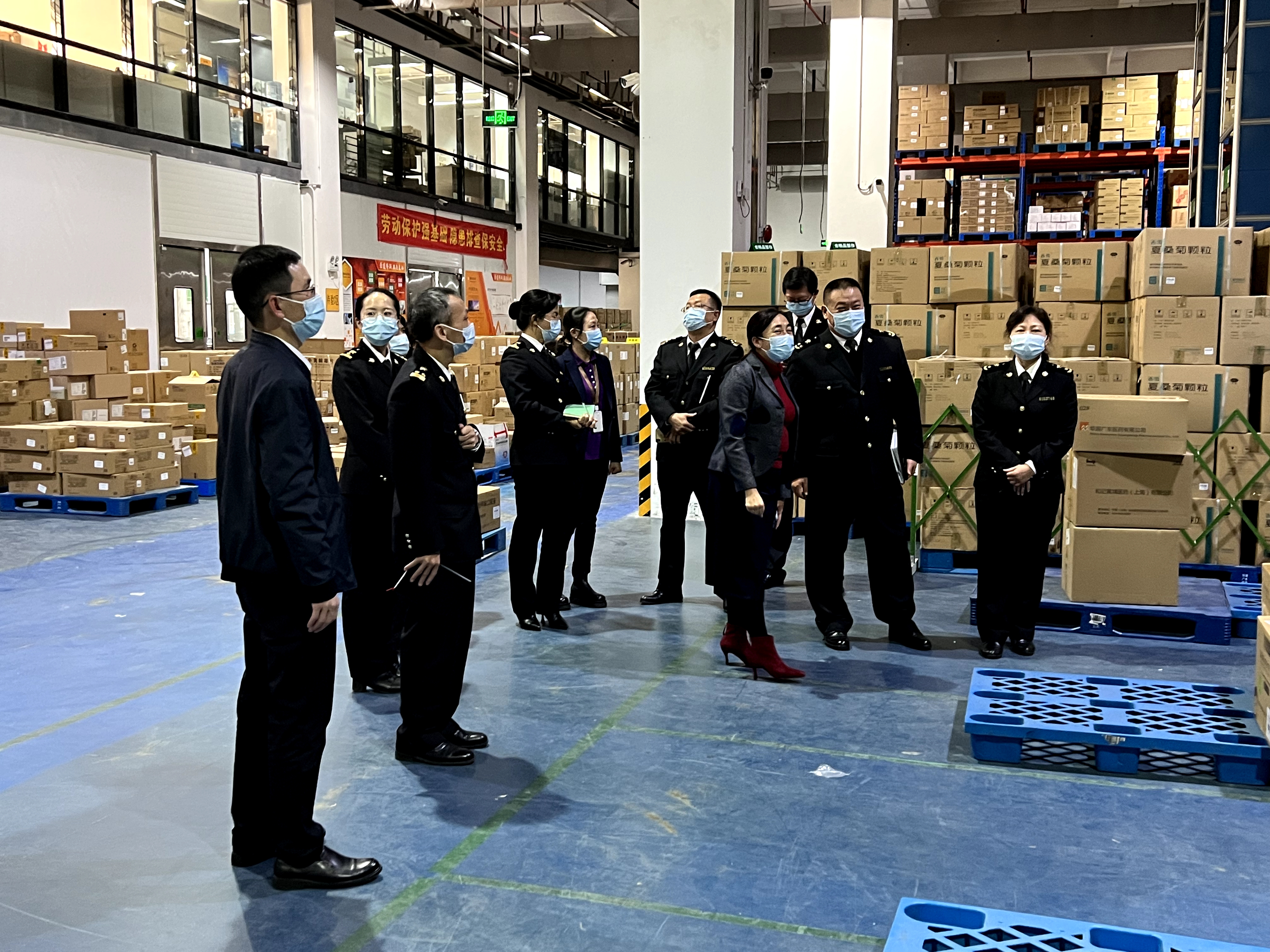 2021年12月22日,廣州市花都海關(guān)關(guān)長(zhǎng)王世晶、紀(jì)檢組組長(zhǎng)董麗震、副關(guān)長(zhǎng)郭劍清、副關(guān)長(zhǎng)梁文鋒一行9位領(lǐng)導(dǎo)到訪華潤(rùn)廣東醫(yī)藥有限公司(以下簡(jiǎn)稱:華潤(rùn)廣東醫(yī)藥)花都物流中心,對(duì)企業(yè)業(yè)務(wù)運(yùn)營(yíng)、進(jìn)口業(yè)務(wù)發(fā)展展開調(diào)研。華潤(rùn)醫(yī)藥商業(yè)華南區(qū)域總經(jīng)理、華潤(rùn)廣東醫(yī)藥總經(jīng)理霍佩瓊、國(guó)際進(jìn)口部分管領(lǐng)導(dǎo),進(jìn)口業(yè)務(wù)、物流業(yè)務(wù)相關(guān)人員共同參與。